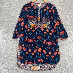 Fig & Flower Top Womens Small Navy Multi Floral 3/4 Sleeve Tunic 1/4 Button Up