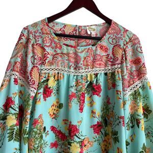 Fig & Flower Women Top S Turquoise Floral Boho Cottage Grandma Peasant Hippie
