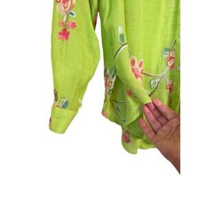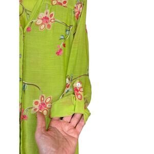 Fig & Flower Women's Embroidered Floral Button Front Shirt Size S Green Roll Tab