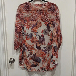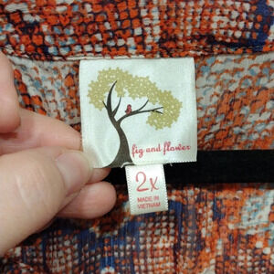 This Fig & Flower women's top features a mixed print with a semi-sheer fabric and a button-up closure. The top comes in a size 2X and has 3/4 sleeves with a regular fit. The colorful floral pattern adds a touch of elegance to the piece, making it perfect for any occasion. The brand, Fig & Flower, is known for its high-quality clothing and attention to detail, ensuring that this top will last for seasons to come. The top is made of polyester material and is perfect for those who want to add a pop of color to their wardrobe.