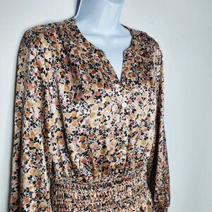 Fig & Flower Womens Silky Floral Long Sleeve Smocked Waist Dress XL S Slit Neck