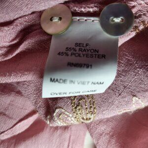 Beautiful dusty pink/light mauve color. Top is flowy with embroidered florals on the front, sleeves and across the shoulders. Sleeves have button for roll up option. In excellent condition.
