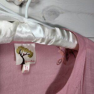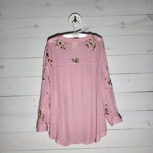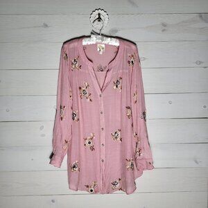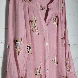 Fig and Flower 1X embroidered floral pink button up shirt. BOHO
