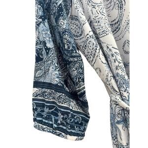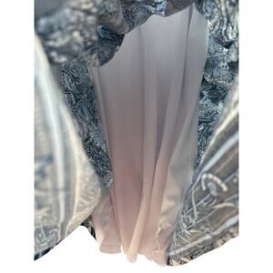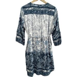 Cream and several shades of blue floral dress. Four buttons at chest, belt at waist, 3/4 sleeves with elastic, fully lined.
