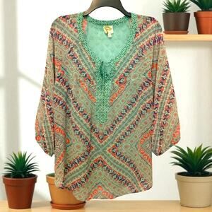 Fig and Flower Anthropologie Popover Top Blouse Mint Green Sheer Crochet XL