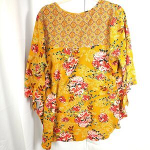 Fig and Flower Anthropologie Womens 2X Orange Colorful Floral 3/4 Sleeve Blouse