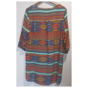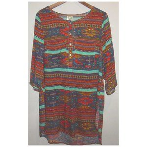 Extra large and extra fun Aztec design shirt that can be used as a dress! This is a great dress to wear on a day out with friends. It will bring some uniqueness and excitement to your day! Pair with a vest or belt.
