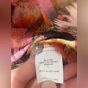The print on this blouse is stunning with earthy floral detail with pinks, purples, and yellows.