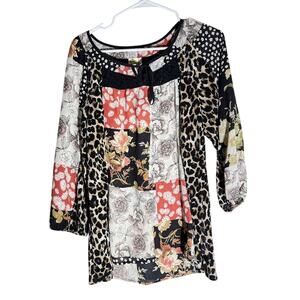 Boho vibes meet bold style in this Fig and Flower long sleeve blouse, featuring a patchwork mix of florals, leopard, polka dots, and lace. With 3/4 balloon sleeves, pleated velvet panels, and tie-front neckline, this eclectic top is perfect for casual days with flair.