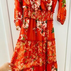 Step into elegance with this Fig and Flower sundress, featuring a ruffled, tiered design in warm brown and orange hues. The 3/4 bishop sleeves and scoop neckline add a touch of sophistication, making it perfect for a wedding guest or resort wear. Its flowing silhouette and vibrant colors ensure you stand out in any setting.
