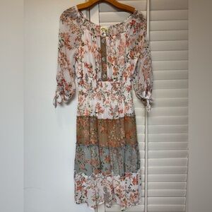 Fig and Flower floral dress with 3/4 sheer sleeves with bows. Features a mix of orange, green, sage green, tans and brown hues. Fall colors!