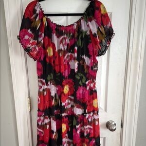 Chic maxi dress with a vibrant floral pattern. Features a mix of bold colors. Ideal for making a stylish impression.