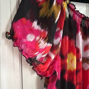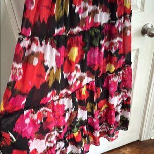 Chic maxi dress with a vibrant floral pattern. Features a mix of bold colors. Ideal for making a stylish impression.