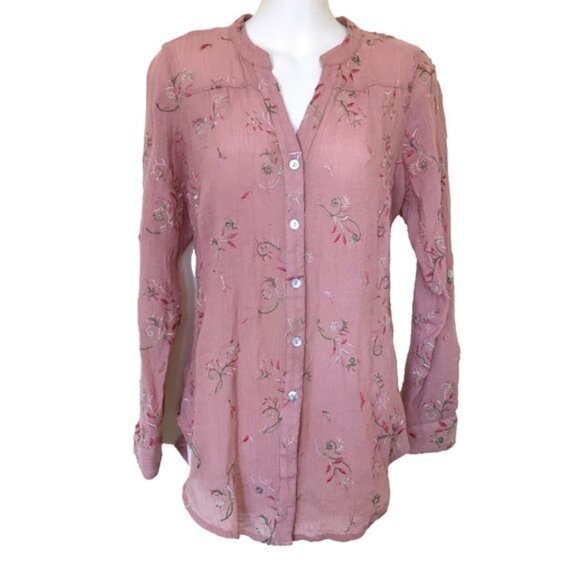 Fig and Flower Pink Embroidered Button Up Shirt Blouse Anthropologie Top