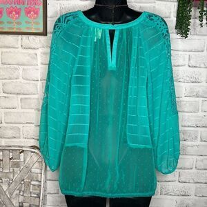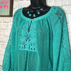 Chic turquoise blouse with elegant embroidery. Features a round neckline and long sleeves. Ideal for versatile styling. Bought this not realizing the size. Beautiful blouse with no flaws