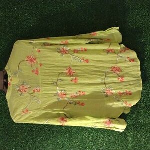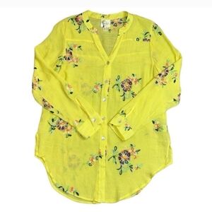 Elevate your style with this vibrant yellow button-down shirt from Fig and Flower, featuring a chic mandarin collar. The lightweight fabric and buttoned design make it perfect for both casual and formal occasions. Its unique blend of colors and style ensures a standout look.