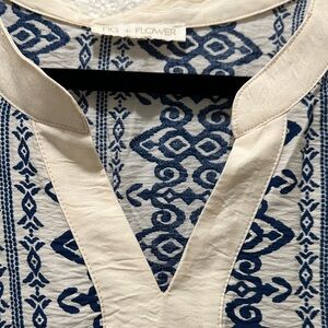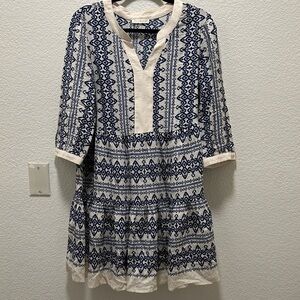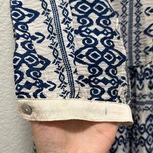 Stylish dress with intricate blue patterns on a white background. Features a comfortable fit and elegant design. Medium oversized