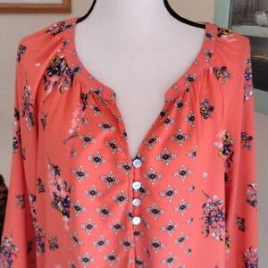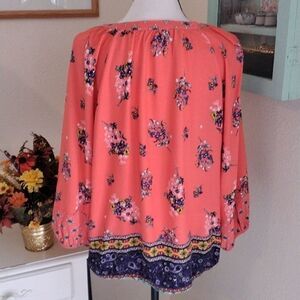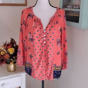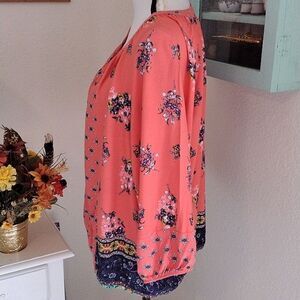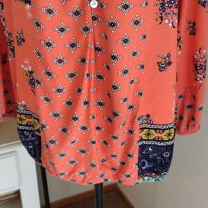Pretty persimmon top. Panel on the front with buttons at the neckline. Border print with elastic at hem to blouse. Full raglan sleeves with border print and elastic at end. Size XL measures 48 at chest, 38-48 at waist, 26 long from shoulder to hem, designed to be blousy. Really flattering and fun.