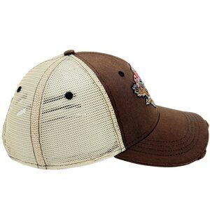 . COLOR: Brown front panels and bill, cream / beige mesh back