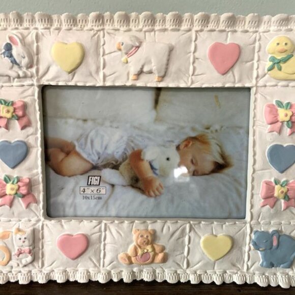 New adorable heavy 3D ceramic quilted designed frame with cute animals, ribbons and hearts. Perfect Baby shower gift. Measures approx. 9"H x 7"W and holds 4' x 6' photo. White spots/lines are glare from lights. *Color may vary slightly from pictures.