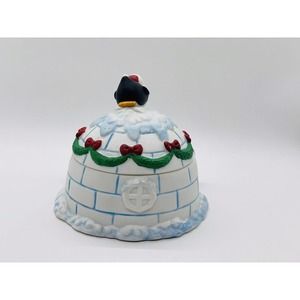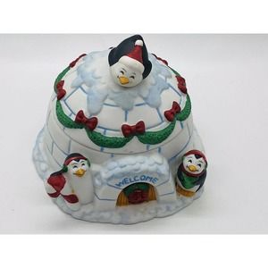 Figis 1995 Penguins On Igloo Trinket/candy Dish/Box With Lid Approx 4.5”x 5”.