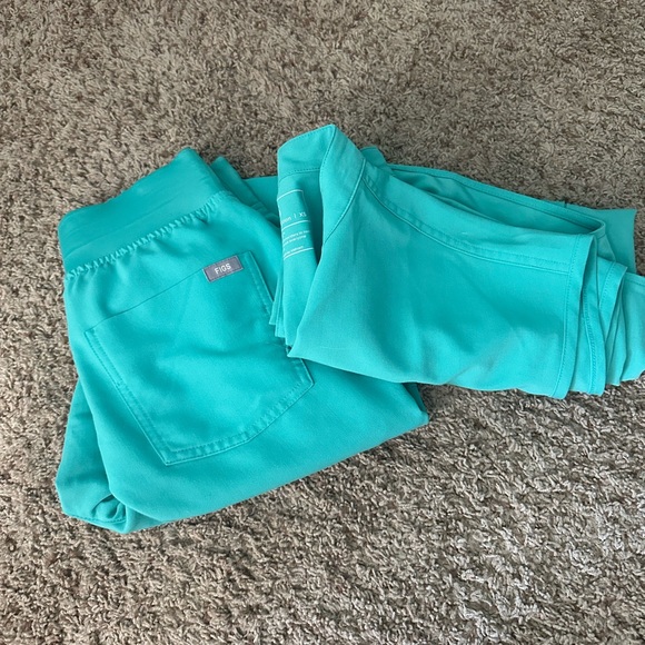 Teal/green (forget color) figs scrubs. Size XS both top and bottom. Rafaela top, Zamora high waisted joggers regular length