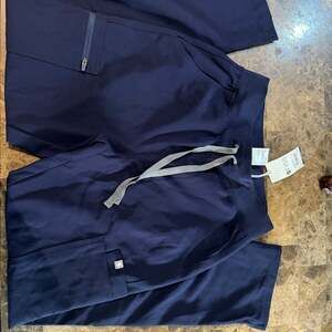 New with tags Figs High Waisted Yola Scrub Pants, Size Small. These navy blue scrub pants offer comfort and functionality for healthcare professionals. They feature multiple pockets, including a zippered cargo pocket, and a comfortable elastic waistband with an adjustable drawstring. Made with durable, soft fabric, perfect for long shifts. The style number is W22SW2013.