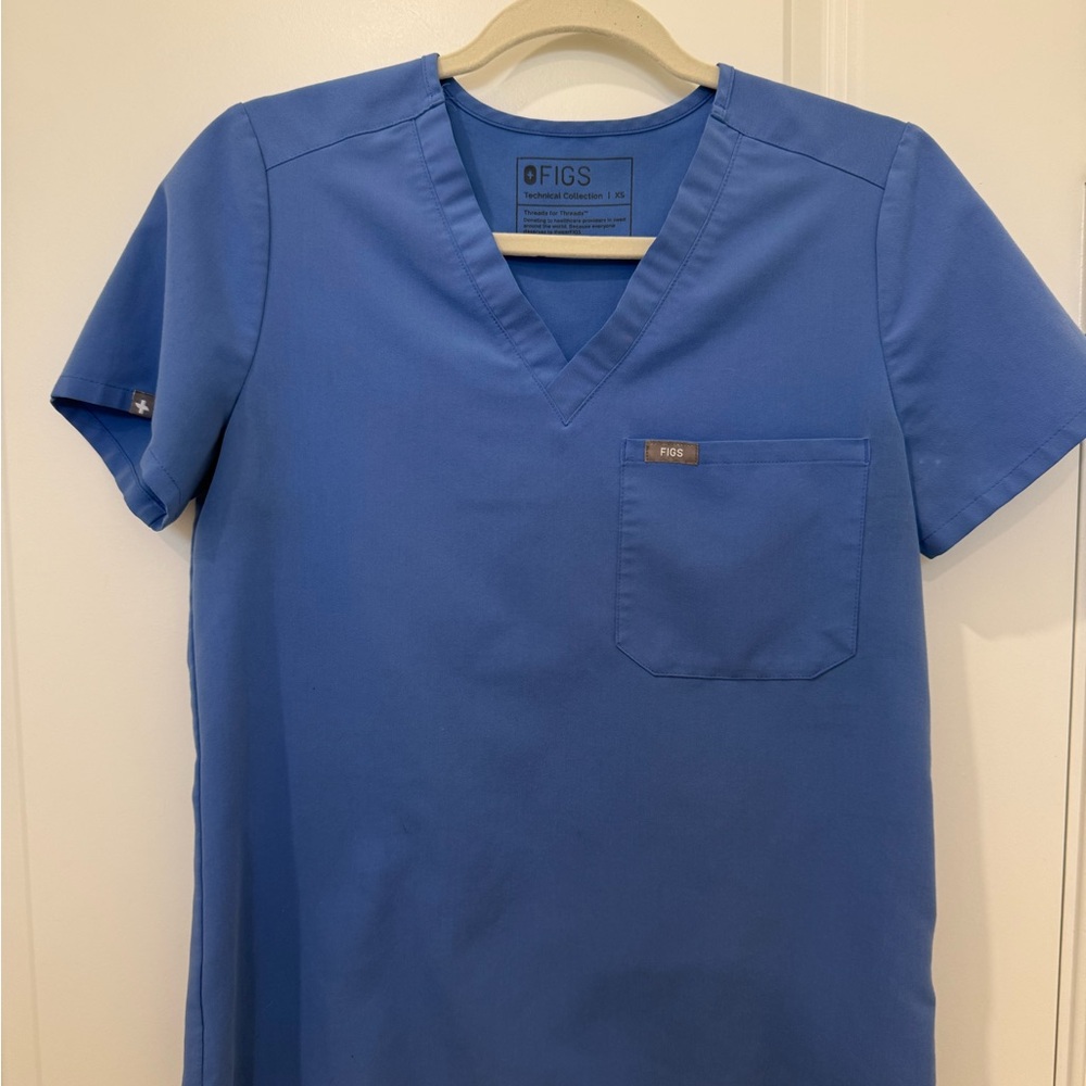 Classic FIGS short-sleeve V-neck. Single chest pocket with subtle logo tab. Lightweight, breathable fabric for daily wear. Clean, professional silhouette.