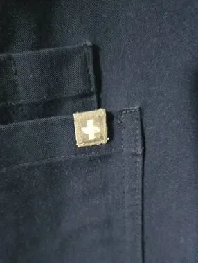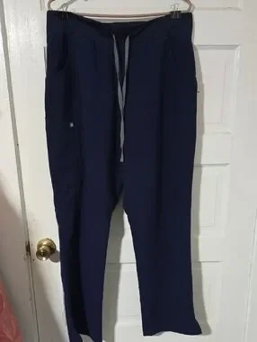 Comfortable navy jogger-style scrub pants. Elastic waistband with drawstring for a secure fit. Side utility pocket for tools or essentials. Sleek, minimal design for daily wear. Breathable, easy-care fabric.
