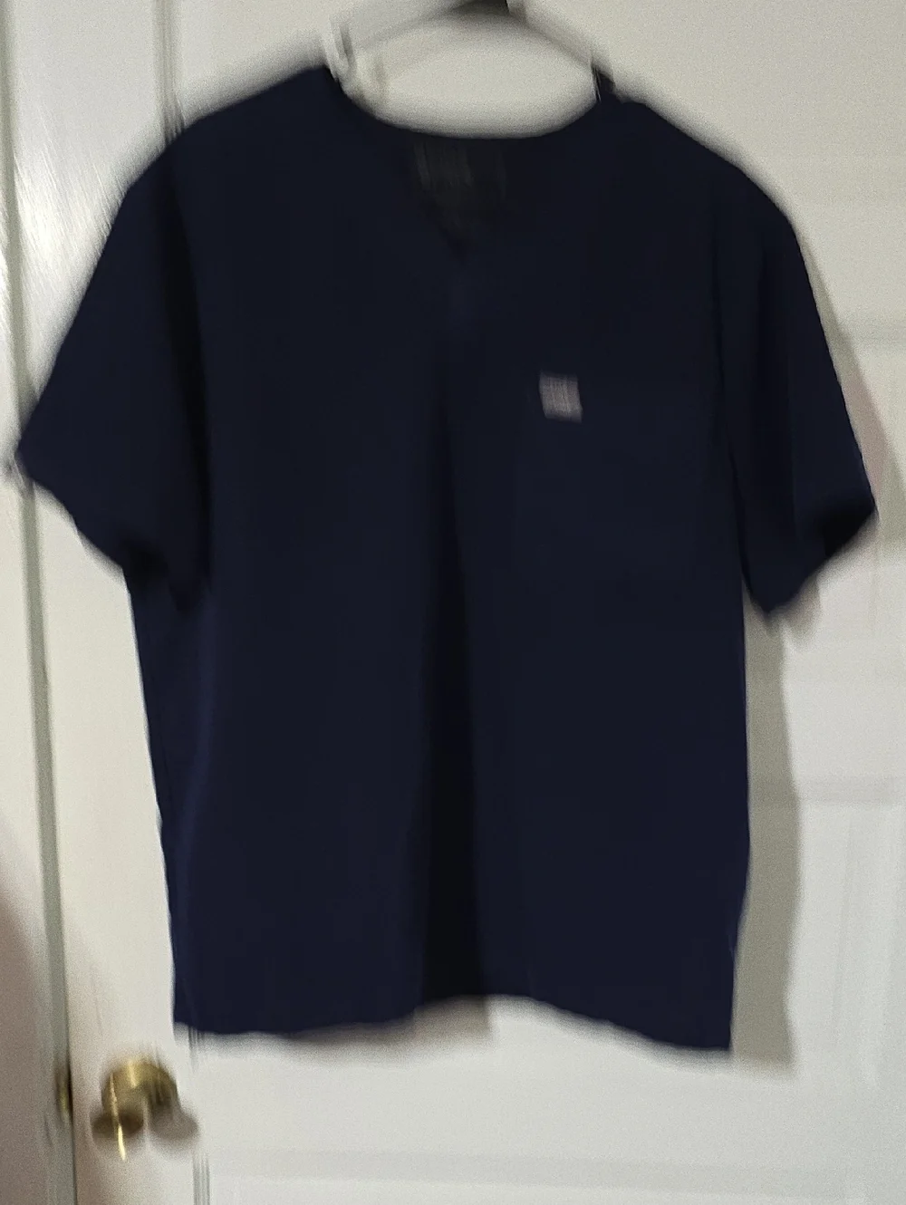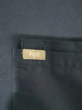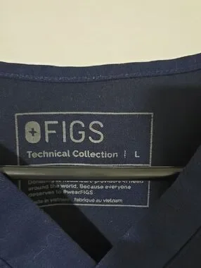 Classic dark navy scrub top. V-neck silhouette with short sleeves. Front chest pocket featuring FIGS branded tab. Simple, professional look.