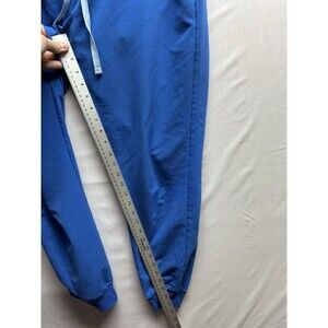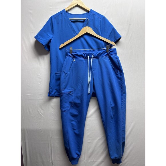 Comfortable blue scrub top and jogger pants. Ideal for healthcare professionals.