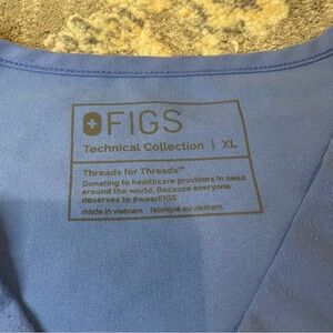 Comfortable blue scrub top by Figs. Features a V-neck and chest pocket. Light stains present, needs a wash