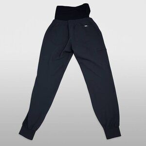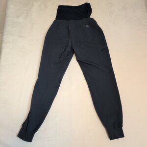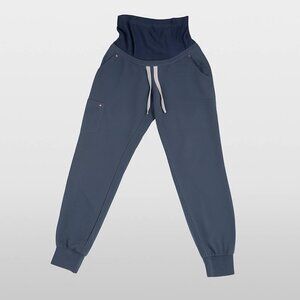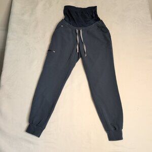 Pre-owned Maternity Figs women's track pants / joggers in blue, size S. Elastic drawstring waistband with visible stretch panel, two front pockets, zip utility pocket on thigh, and cuffed ankles for a tapered fit. Comfortable, work-ready style ideal for clinical or casual wear. No visible stains or damage in photos; normal light wear consistent with previously owned item.