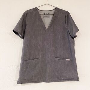 SO cute and in good preowned condition from Figs! Total of three pockets. Classic fit. One interior security pocket. Two front drop pockets. Modern V-neck. Darted back. Side-slit hem. Gray in color. Size M.