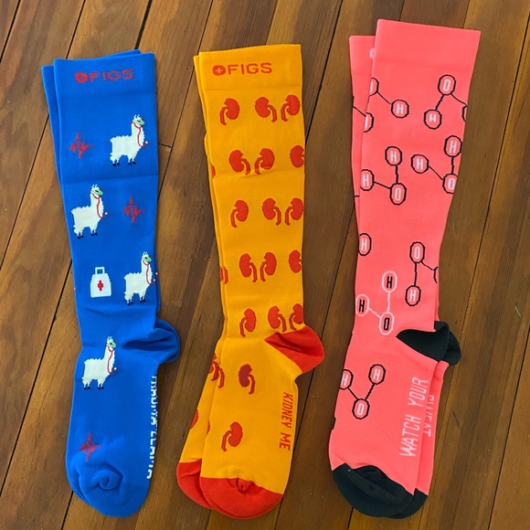 Orange pair has kidneys on it and the bottoms say “you’ve got to be kidney me” on each foot.