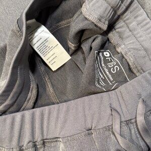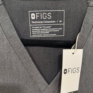 Stylish Figs scrub set in dark gray. Includes a V-neck top and drawstring pants. Ideal for healthcare settings.