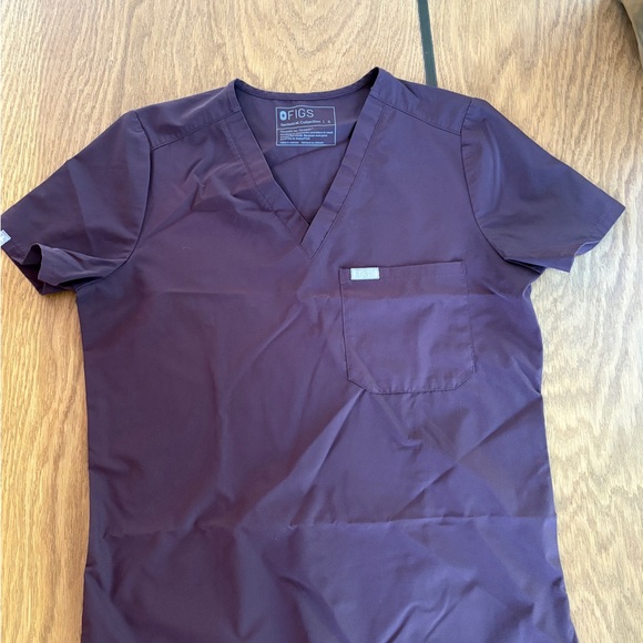 Deep purple scrub set. These are highly breathable, lightweight, fast drying. My most flattering set. Top is size S and pants are size XXS.