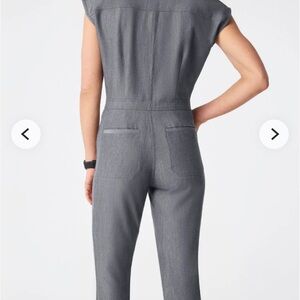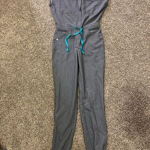 Graphite scrub jumpsuit from Figs. Sleek and professional design. Worn maybe 3 times and washed once. This can fit XS-s and has an adjustable waist tie! Cute jogger legs, and zipper neck. This is great, just don’t wear this color anymore!