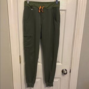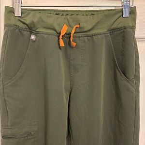 Experience comfort and style with these Figs green cargo pants, featuring a relaxed fit and a tapered leg design. The elastic waistband ensures a snug fit, while the ribbed cuffs add a modern touch. Ideal for both casual outings and everyday wear, these pants are a versatile addition to your wardrobe. Zipper on side pocket is broken. Please look closely at picture
