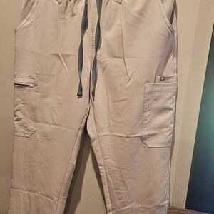 Stylish high waisted joggers in light gray. Perfect for casual wear. worn twice. see other posting for matching set. no rips, stains, smoke free home. nearly brand new. Medium petite high waited yola scrubs pants.