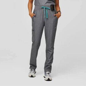 Elevate your professional style with Figs High Waisted Yola Skinny Scrub Pants in Graphite Gray. Designed for comfort and durability, these women's XL Petite pants offer a flattering fit while maintaining functionality for a busy workday.Stylish gray cargo pants with teal drawstrings. Ideal for everyday comfort. Graphite color. EUC