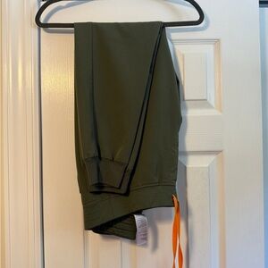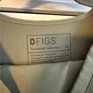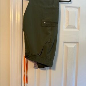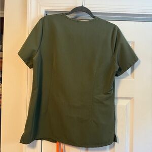 Comfortable olive green scrub top. V-neck with short sleeves. Single chest pocket.