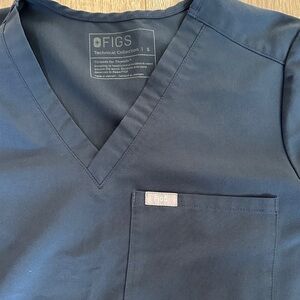 Comfortable navy scrub set. Short-sleeve top with chest pocket. Pants feature pink drawstring and side pocket. Small signs of wear.