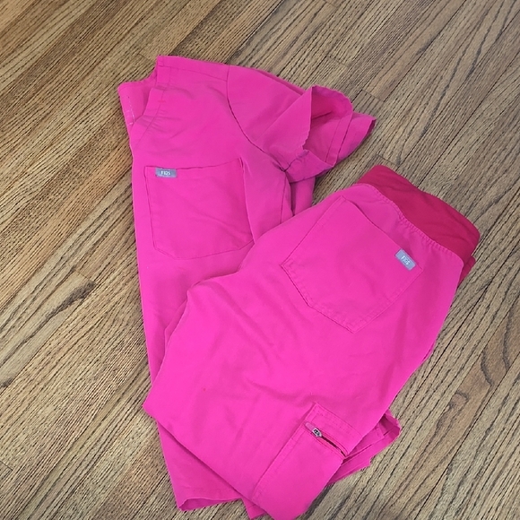 Bright and comfortable pink joggers perfect Easy to wear and comfortable for any job. does have small pen markings shown in second picture