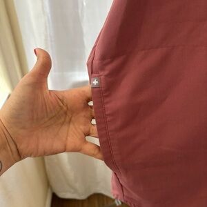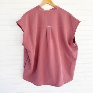 This pink blouse from Figs features a relaxed, boxy fit and a stylish mandarin collar. The blouse is designed with a comfortable sleeve length, making it perfect for a casual yet elegant look. Its soft pink hue adds a touch of sophistication to any outfit.