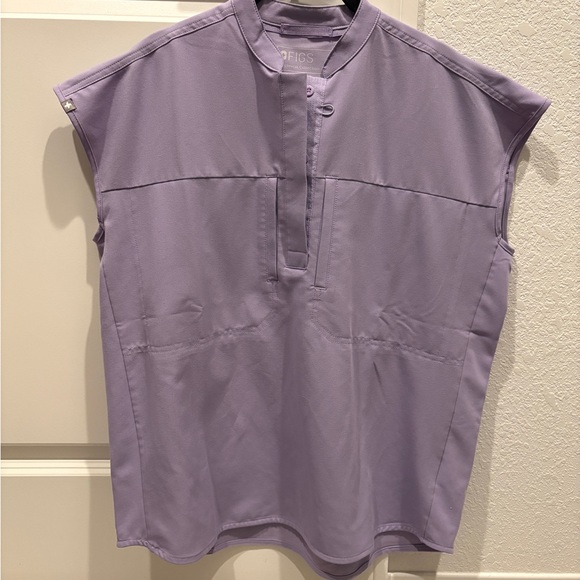 This Figs blouse in a rich purple hue features a boxy silhouette and cap sleeves, offering a relaxed yet stylish look. The mandarin collar adds a touch of sophistication, making it a versatile addition to any wardrobe. Crafted from lightweight fabric, this blouse ensures comfort and ease throughout the day.