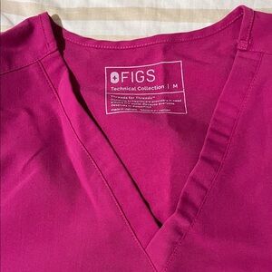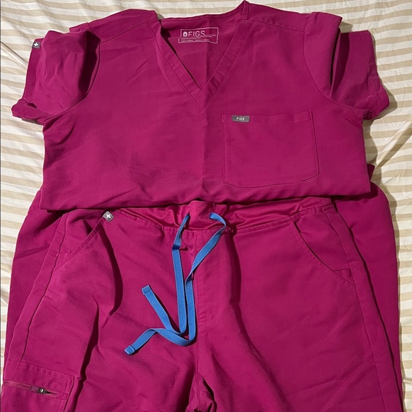 Vibrant berry scrub set by Figs. Features a top and pants with striking blue drawstring. There are some detergent stains on this set . Images will be attached for reference.