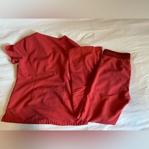 Comfortable red scrub set by Figs. Includes top and pants. Ideal for medical professionals.