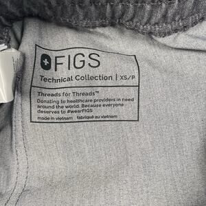 The product is a pair of FIGS scrub pants in a women's XS size, featuring a high-waisted design in a solid gray color. Made of polyester material, these pants are specifically designed for the medical industry and are manufactured in Vietnam. The Zamora jogger style offers a comfortable and stylish option for professionals in the medical or dental field, with a focus on functionality and practicality in a work environment.