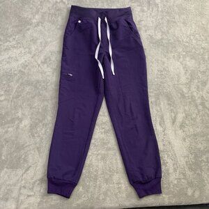 This is a FIGS brand scrub pants for women in size XS petite, made of a Polyester Blend material in a Solid purple color. The pants feature a Zamora Jogger style. They are designed for medical professionals.